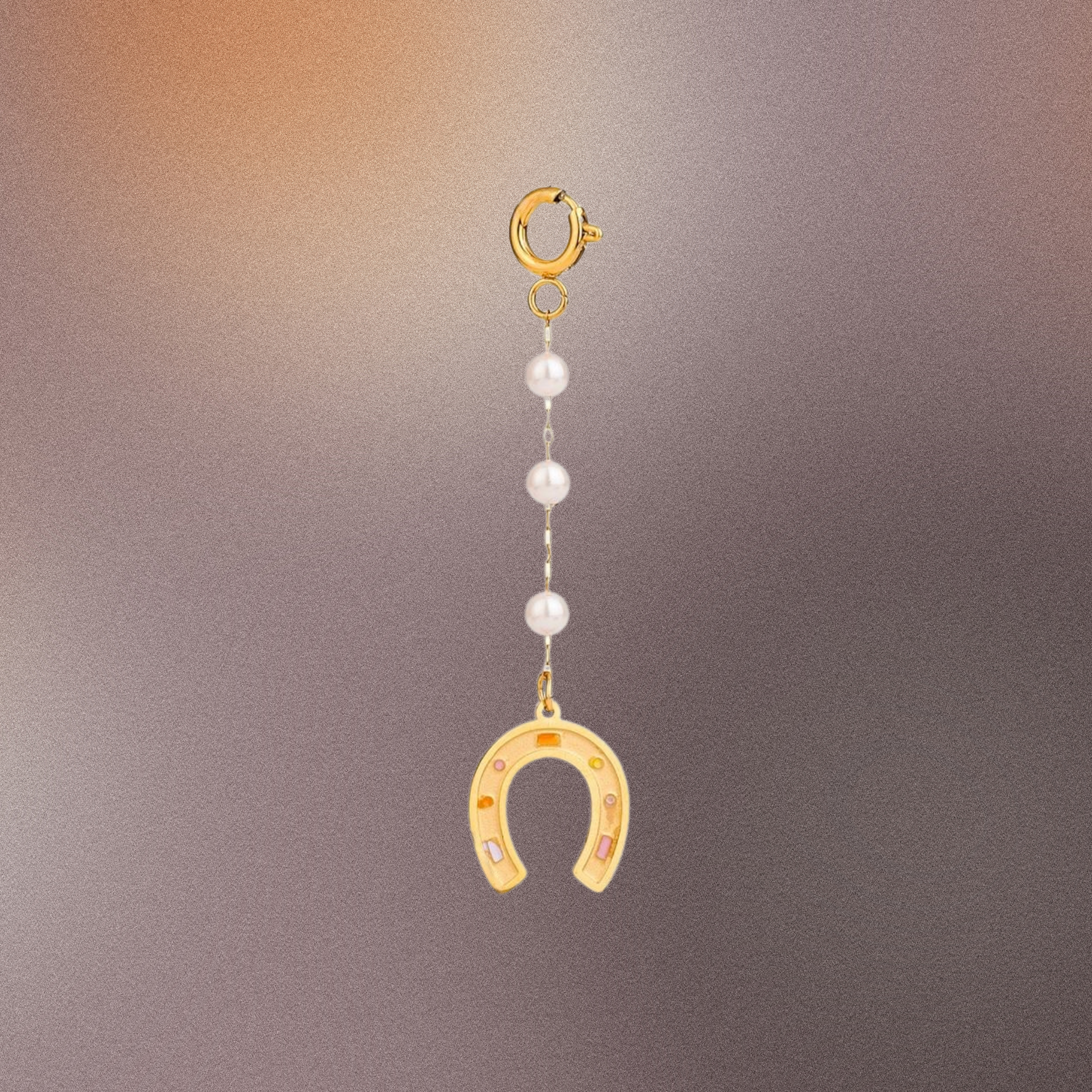 The LUCKY Charm boasts a glimmering gold horseshoe adorned with dainty pearls, making it a sophisticated emblem of luck and elegance.